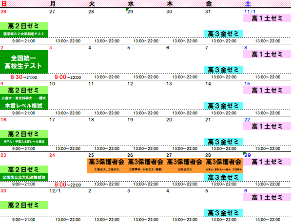 11月の月間予定です。 全国統一高校生テストの実施日 11月2日(日...