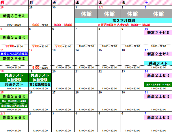2026年1月の月間予定です。 ※事情により変更となることがあります...
